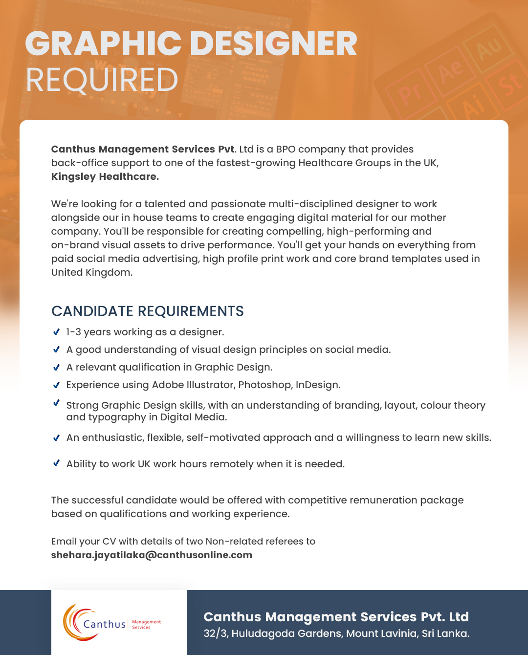 Canthus Management Services Pvt. Ltd, a trusted BPO partner for the rapidly growing Kingsley Healthcare UK, is looking for a talented and passionate Graphic Designer to join our creative team.